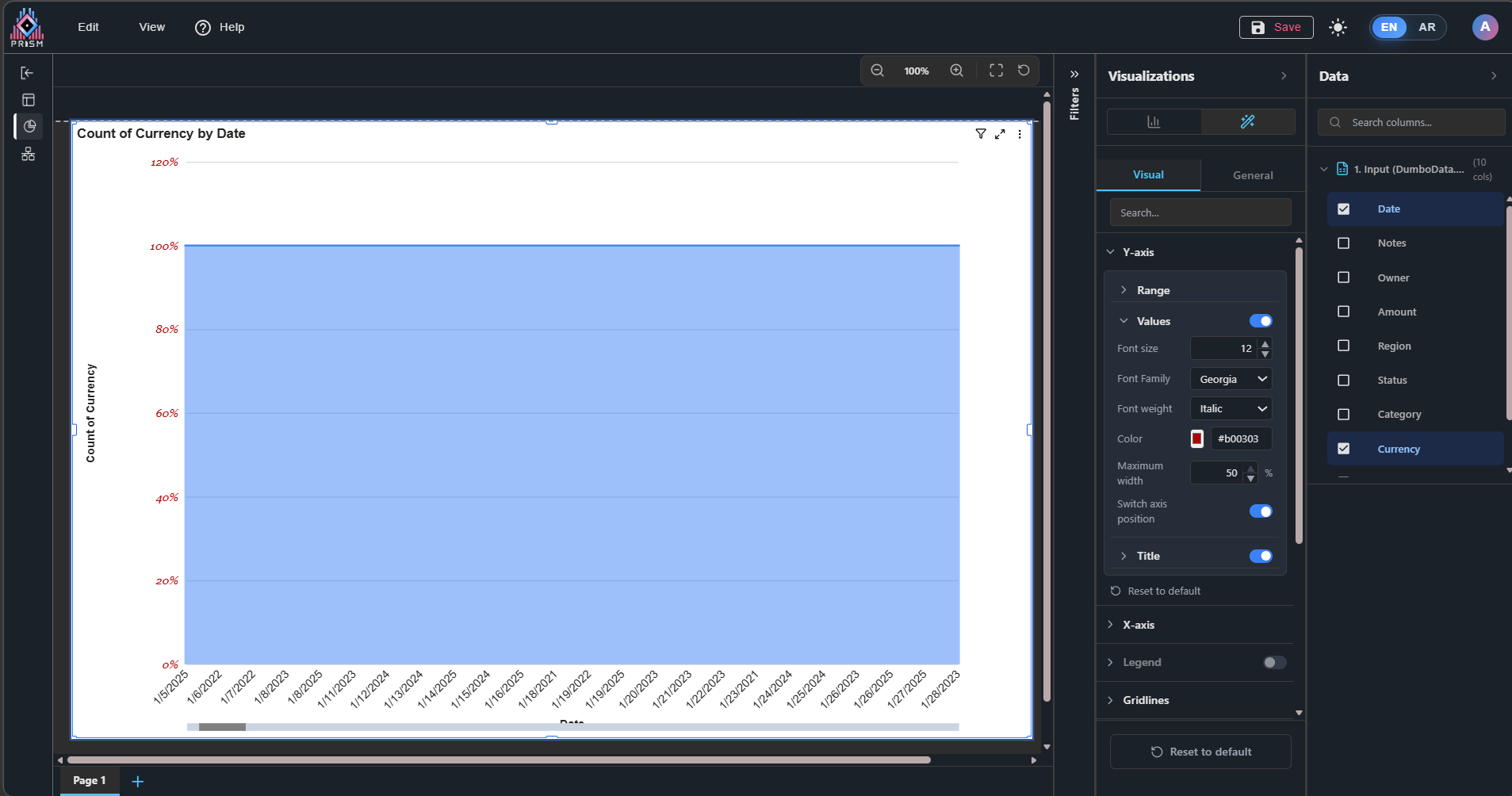 2. In Y-axis > Values, the Maximum option does not work, and changing the Axis Position does not work as expected.