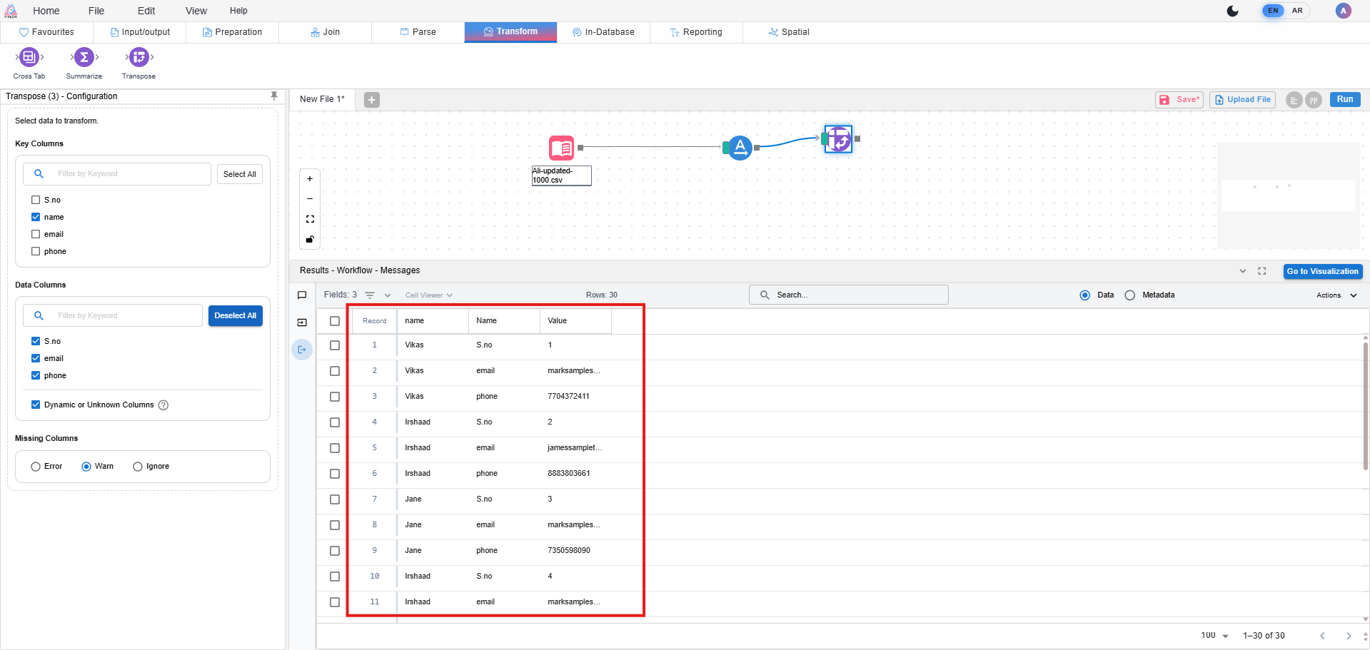 Need to fix the issue in the Transpose tool output as you can see the pictures so you can able to see the arrangement of the data is different then Alteryx.