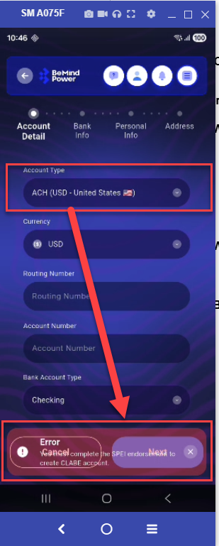 On the Account Details screen, when selecting Account Type (CLABE or PIX), the error message appears with a light background, causing it to visually blend or mix with nearby button text, making it hard to read.