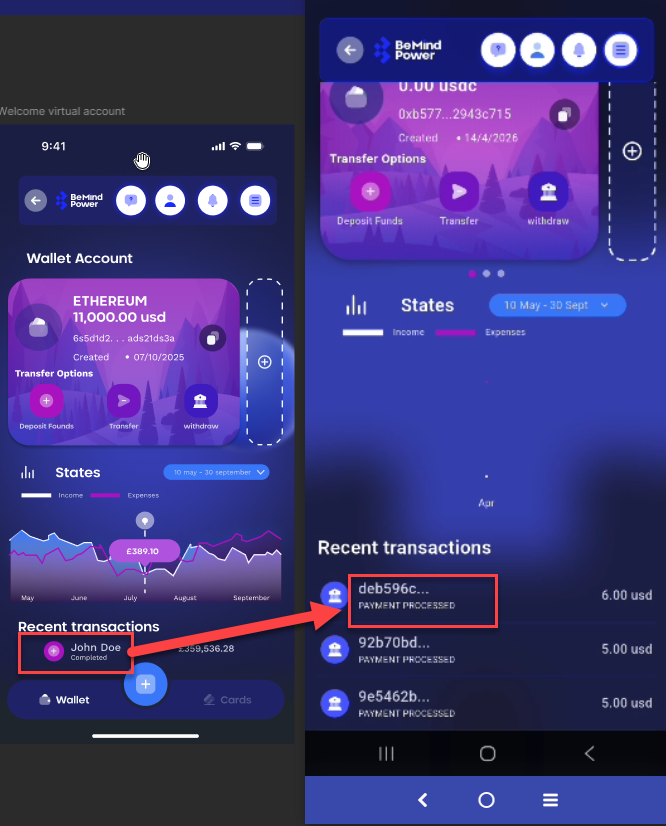 - For completed transactions, the status is shown as “PAYMENT PROCESSED” (all caps) instead of a proper “Completed” label