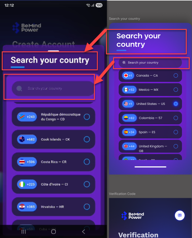 On the Create Account screen, the phone number dropdown UI does not match the Figma design. Multiple inconsistencies are observed: