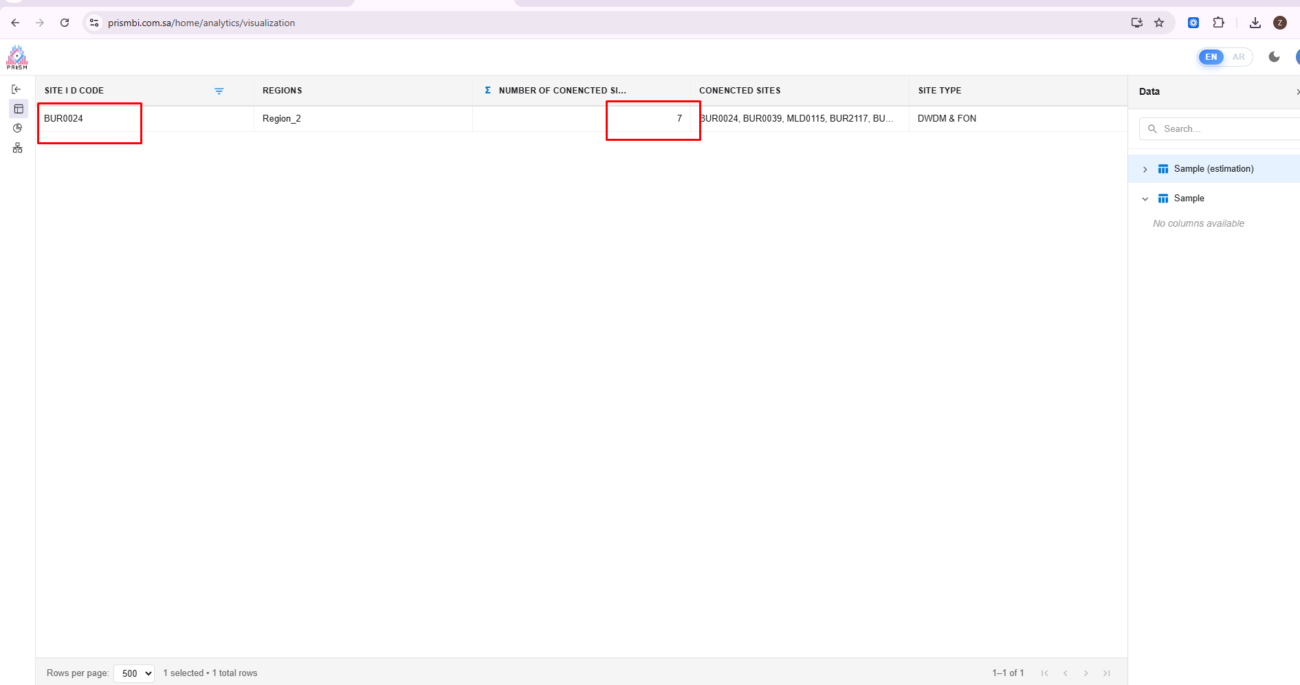I filtered the data to show only record with site ID 'bur0024', in the data we have 7 connected sites against this site ID code, but on chart it shows 1 on prism and 7 on power BI (Correct Result). On prism the result is same through out the graph though.